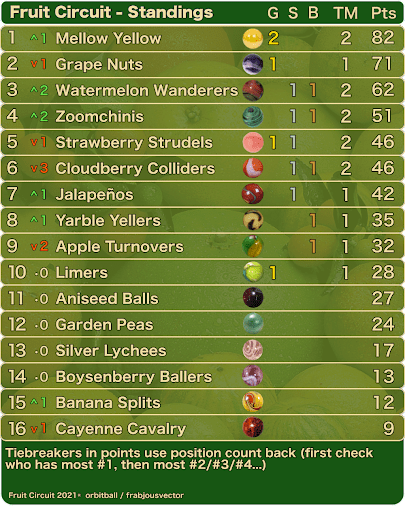 A team that did get much better in the final races, however, was Mellow Yellow. Yelley and Yellup respectively took home two golds in the final two races to give Mellow Yellow a dominant win over the Grape Nuts and Watermelon Wanderers. The Cayenne Cavalry finished with fewer than 10 points after the Banana Splits overtook them after the race at Rambutan Run.