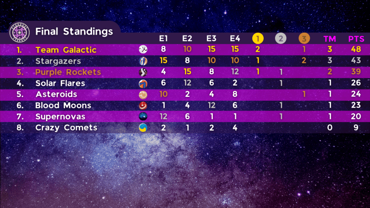 After being knocked out in the heats in Collision, the team turned their eyes to Starry for the final event; the Marathon. Despite qualifying poorly, and falling to last place early on, Starry managed to claw back places lap after lap, and by the time the final lap came around, Starry had climbed up to fourth place. Team Galactic would finish the league in seventh, tying the Hazers in points, but losing out to them in terms of medal count.