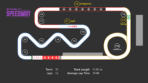 Pulsar managed to qualify well again at the Aquamaring, and early in the race held the lead. They could not hold onto it, however, and fell to seventh. After another poor qualifying at Tumult Turnpike, Starry managed to claw up into the contenders for the lead once again. With one turn to go, it appeared that Starry would finish the race in fourth. But, as is tradition with the team, with an excellent divebomb to the inside, Mallard stole fourth, with Starry placing fifth plus the fastest lap, in the fifth race of the season, propelling Starry to fifth in the individual championship.