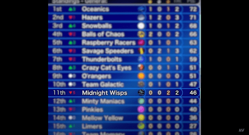 The Midnight Wisps would face off against the Hazers in the first round of Curling. They did great to start with a 3-0 lead. After the Hazers got close and made it 3-2, Wospy came in clutch and made it 5-2. When the final Hazer came up, the Wisps led by three. It seemed like there was virtually no way they could blow it, but they did. Misty was the final Hazer, and they came in clutch for this team, making the final score 5-4 for the Hazers. The Midnight Wisps finished in tenth, but surprisingly, didn’t lose any points on the leaders. That’s how inconsistent every single team was.
