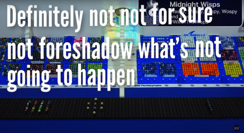 Admittedly, the Wisps did not perform strongly in the Qualifiers, placing last in the Relay to start and only placing as high as eighth by the third event, leaving them in second-to-last with one event to go. It was only with Wospy’s first-place finish in Funnel Spinning that the team was able to qualify in seventh out of the sixteen teams, but they had done enough. The Midnight Wisps were in the Marble League.