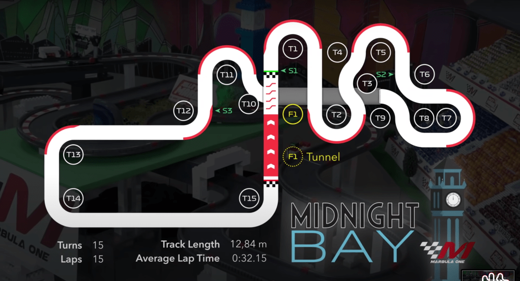 On the final night, a full house arrived at the stadium for the Midnight Bay Grand Prix: a perfect way to end the Midnight Melee on the shore of Midnight Bay, just like in Marbula One. The track was returned to its racing form but would be slightly shorter, with twelve laps instead of the sixteen from the prior Marbula One season. The grid would be in reverse standing order, with Eyeball of the Demon Eyes starting in the pole and Wispy in the back.