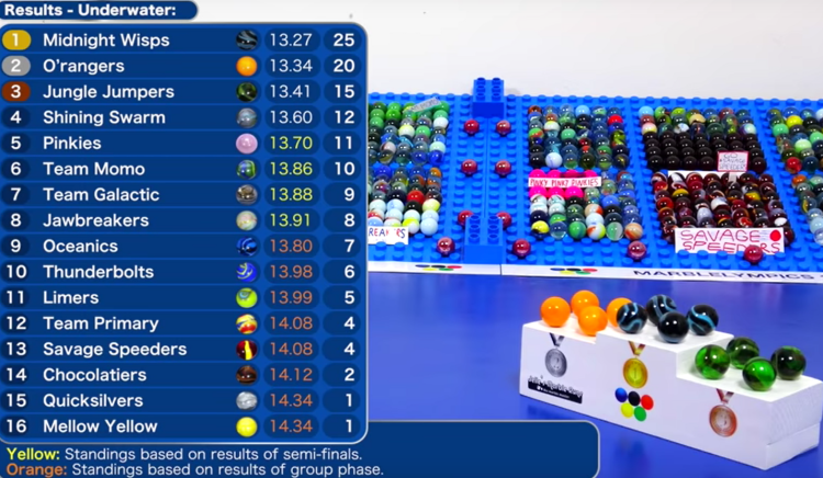 It was surprising, then, when Skip finished fifteenth in the first event, the Underwater Race, and last in Balancing. There was potential to get on the podium in Funnel Endurance, with Leap leading the finals twice, but a few well-timed bumps against Razzy and the others sent them spiraling down to eighth place. The team sat in fourteenth place heading into the Gravitrax Slalom, where they reached the final and finished in third, earning their first medal in two years. The Jumpers rose to eleventh overall.