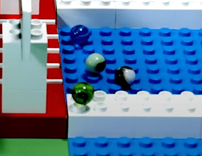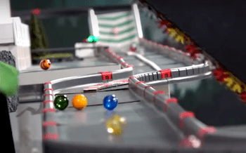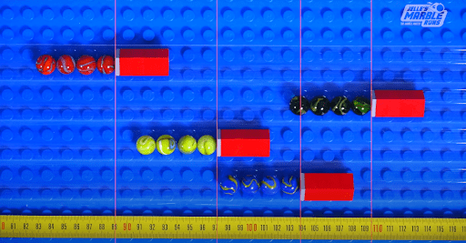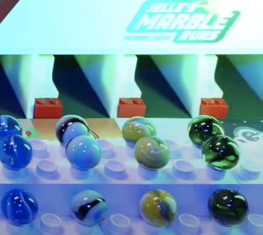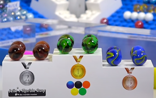 Suddenly, a great belt exit and a misfire from Mellow Yellow’s Yellow let Hop overtake four marbles at once. Greg Woods’s voice goes one pitch higher: “Hop comes out of nowhere! And believe it or not, the Jungle Jumpers are in the lead!”
