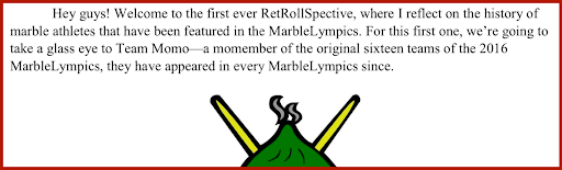 First in line to buy tickets for the 2018 Marble League in Arctic Circle, Stynth drafted an article right after seeing Team Momo in action from the stands: a profile of Team Momo, the first “RetRollSpective.” It caught the eye of management at the Marble Sports Performance Network (MSPN), and they sent Stynth to cover breaking news: Team Momo’s double injury and their merger with Team Primary for the rest of the League.
