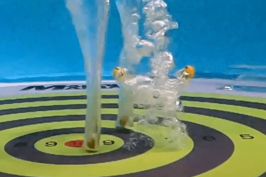 The first event would be Extreme Diving, where marbles would leap from a skyscraping height onto the underwater target. The Constrictors showed right away they were last to jump, but not least: in their first jump, all but one stayed close to one another and to the bullseye, scoring one 9-point landing.