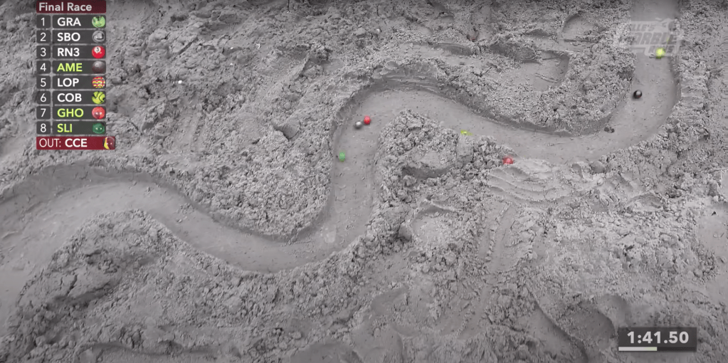 Slimer, similarly shocked by Plasma’s DNF, honed in their cat-like reflexes to barely avoid ploughing through the sand as well and to keep themselves rolling. Suddenly, the championship was wide open for their taking; the top two were out and Ducktape, the closest marble in points, was nowhere to be seen.