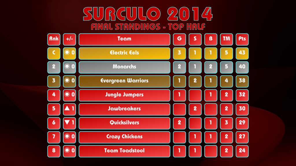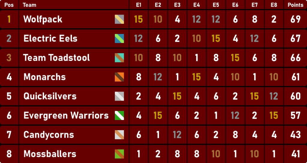 With their success in the qualifier event, it was to no one’s surprise that Argent was nominated to run in the Funnel Race. Their 14th place finish, after such high expectations, was rather sobering. After two more bottom-four finishes, the Quicksilvers were dead last, and the Jungle Jumpers were just ahead of them in 15th. Something had to be done.
