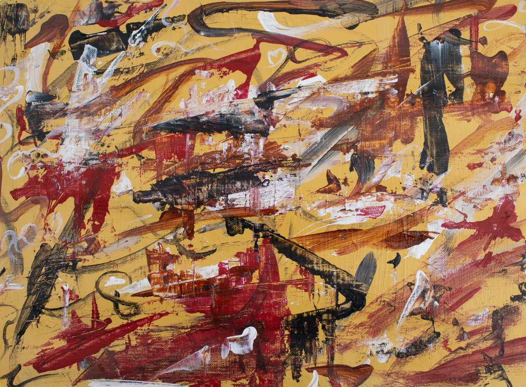 With that, both marbles began to paint. A faint stroke of black spanning the whole canvas started them off. Then another, and another. Using a palette knife, Aryp scooped up some brown paint and pressed it onto the canvas. They raked the backside of the knife over the fresh paint, making it smear. Yellah had their turn with a splotch of white—with a technique akin to an angry cat, they swiped the knife left and right.