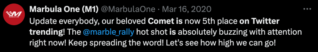 “Excellence, Champion, Victory. Congratulations to our hero, Red Number 3, for cementing their legacy as a Marble Rally legend.”