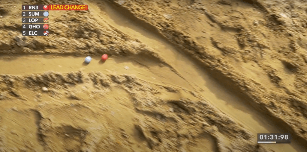 “And look at THIS! Red Number 3 out of nowhere has taken second place! We were too busy looking at that crash-out, that spin, and now Red Number 3 is up into second. If they finish there, that will be enough to solidify the 2018 Sand Marble Rally championship.”