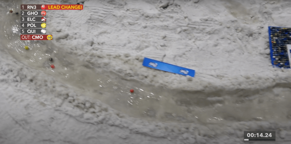 Starting in the back row, Red Number 3 seemed out of sight and out of mind as the camera focused on the top three at the start: Phoenix, Quicksilver, and Ghost Plasma. As Black Knight crashed out, Red Number 3 suddenly appeared in second place.