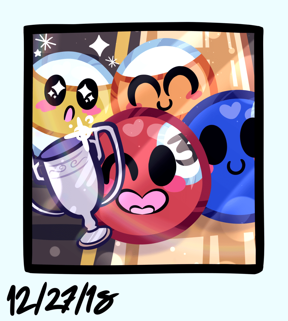 “I found this at home. Red came home a day early from their victory tour to get a break from the paparazzi. I brought a tripod and everything so I could be in a picture with my sibling for once.” Blue passed us the Rollaroid, pointing out their relatives, Stripe Numbers 9 and 13. “Red winning in 2018 was pretty much the best thing ever. They’d been training so hard for so long, and coming just short in 2017 was really hard for them. But they bounced back, and they kept working. We were so proud of them, not just the victory, but just all of their work and dedication, too.”