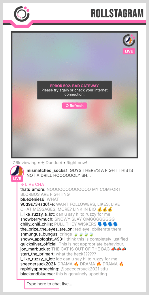 “-because you’re not so perfect now, are you?” barked Snowy, the first part of their confrontation clipped by the filmer’s delay. It’s really heating up, mumbled a quiet voice from behind the camera, audible now the rest of the room was quieting. “Yeah, you think you’re the most important marble out there, but you’re not! And I know you think I’m going to lie down and give up so you can feel special, but think again!”