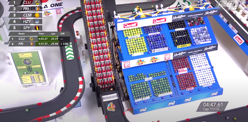 On Lap 16, Speedy was overtaken after a poor belt exit. Greg Woods chuckled: “Wospy, into the lead – and that was from dead last!” Speedy accelerated past Wospy the next lap and built up a bigger lead, but the two were neck and neck again at the penultimate lap.