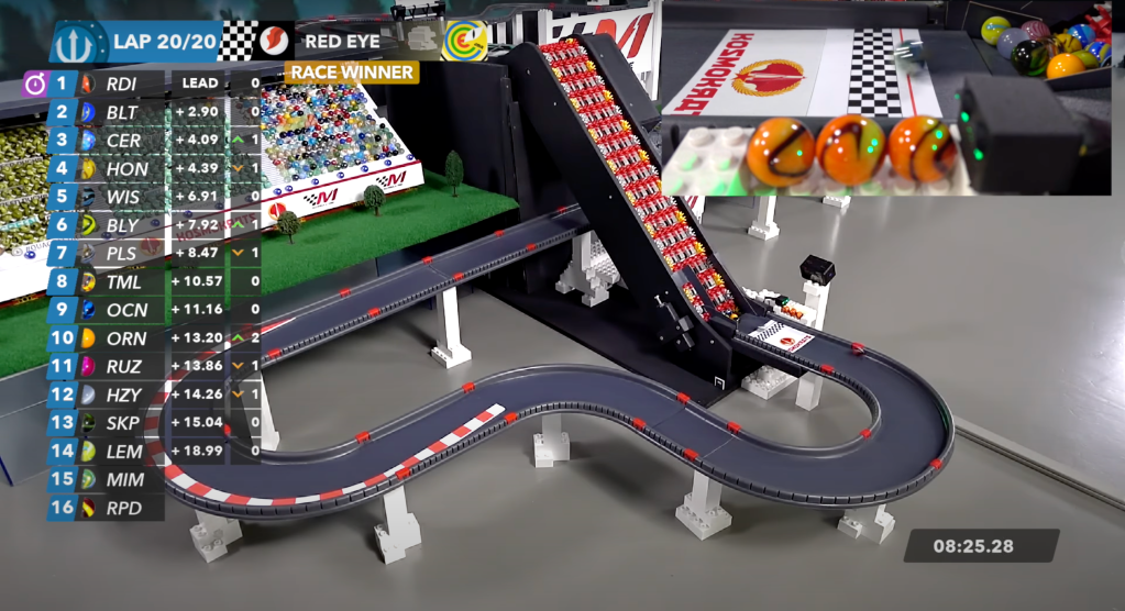Wospy tried to exorcise their demons and took advantage of a massive opportunity when Speedy blew the split turn in the penultimate lap, moments after Wospy had set the fastest lap. Wospy was in the lead with just one lap to go. Although a Tank Bowl between Limelime and Ruzzy just ahead of them enacted a Blue Flag, Speedy’s final go before the end of the race was not enough. The two marbles nearly crossed the line together, but by nine-hundredths of a second, the clock had struck midnight at Palette Park. Wospy had turned it all around and won a Marbula One race for the first time! Speedy congratulated Wospy on the win after the race, stating it was ‘one of the best races of my life.’
