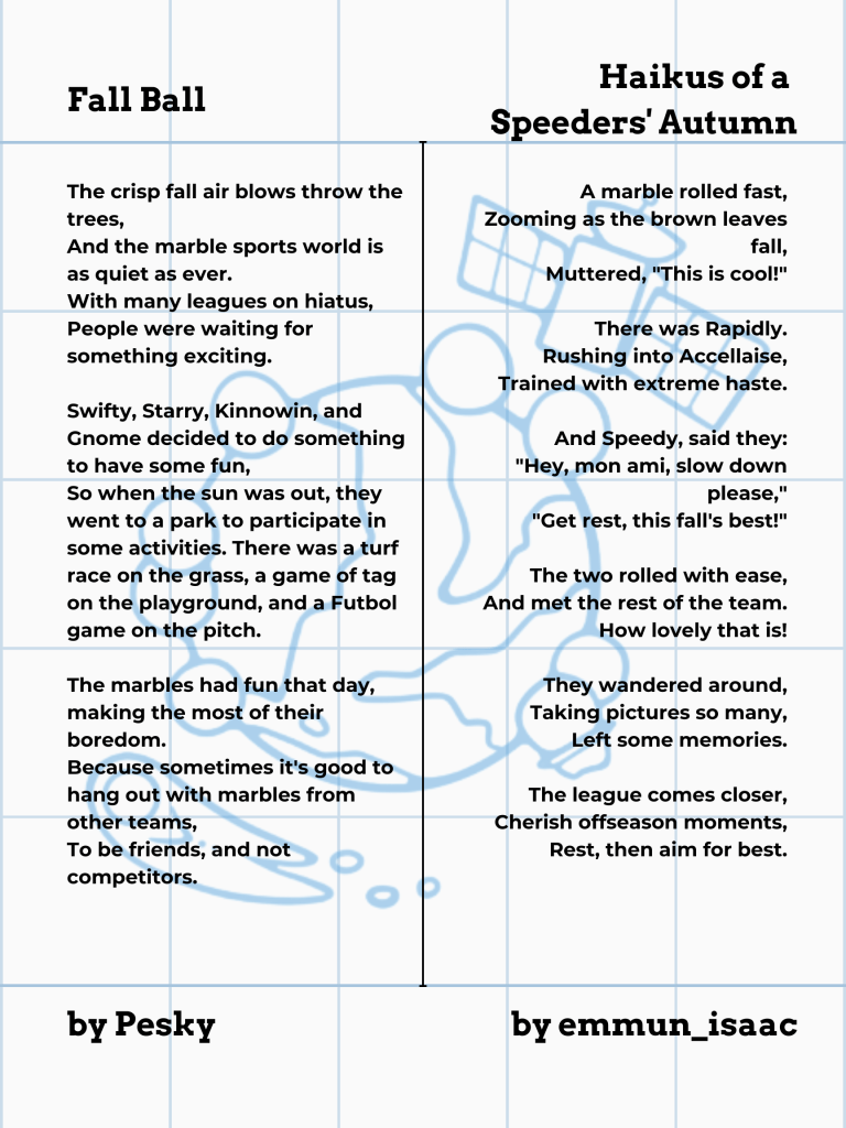 They are a collection of creations from the community of Marblearth in response to a multitude of tasks, from story writing, poetry, and acrostics, to art, photography, and cooking crafts! These tasks offer a chance for everyone to join in whenever they feel like it, to show off their skills and learn some new ones!