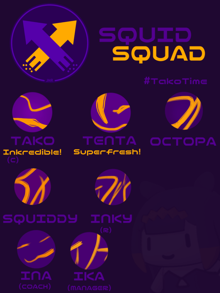 Team Members: Tako (C), Tenta, Octopa, Squiddy, Inky (R), Ina (Coach), Inka (Manager)