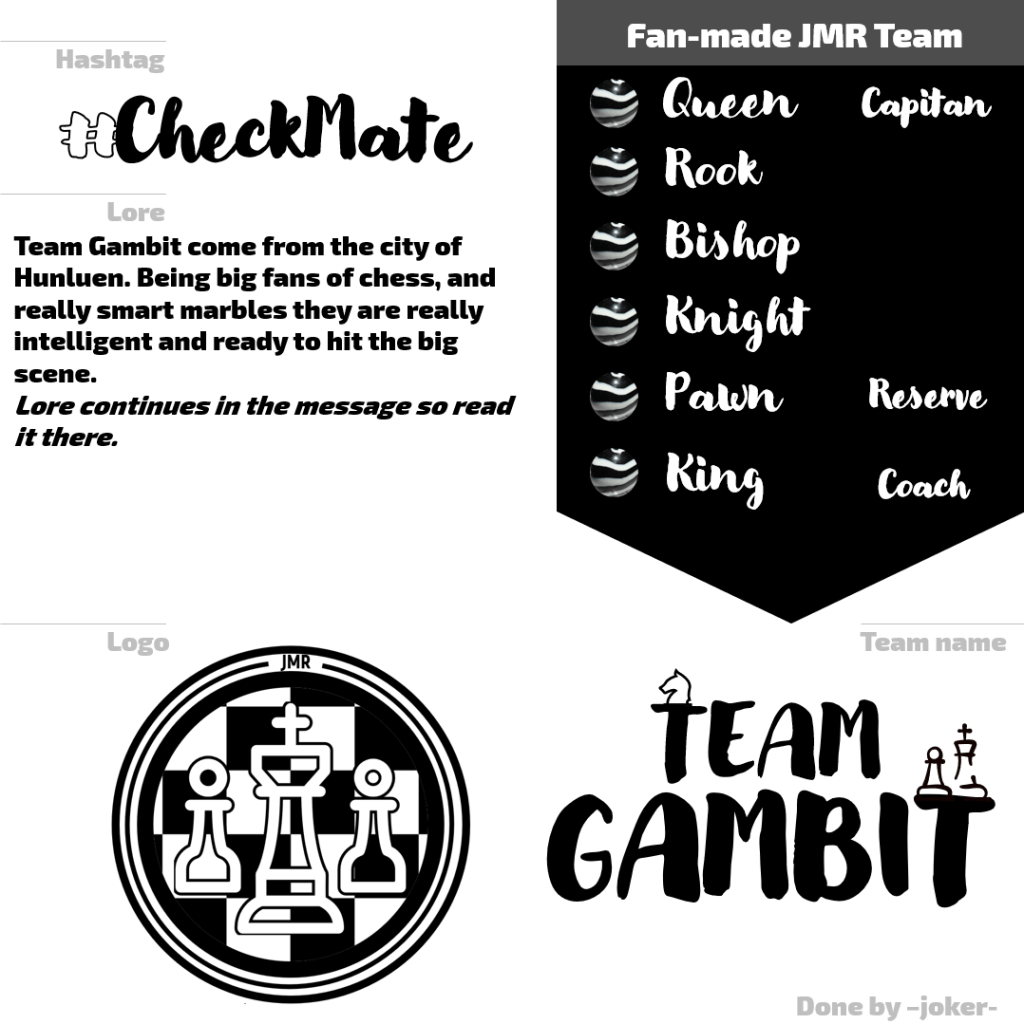 Team Gambit comes from the city of Hunluen. Being big fans of chess, and really smart marbles they are really intelligent and ready to hit the big scene. The team of Queen, Rook, Bishop, Knight, Pawn, and King originally met during a chess competition in Hunluen and after once seeing the ML broadcasted on the TV in their club, they were really inspired to try marble sports themselves. After forming a team they started training. They specialized in puzzling events like Maze and Code breaking. Their training was going really well and with that, they started to seek competitions to participate in. Soon they’ve seen an application to Cranthym Challenges tournament organized by the Balls of Chaos. Excited to compete, they applied but having no manager hurt their chances as they weren’t able to attend the interview for the competition, not being warned about it. Soon, they found out that they, unfortunately, weren’t accepted to participate in the Cranthym Challenges. That was a heartbreak for the team. After that King said to the members: “Even if we aren’t in there, we still can reach the top stages in the future. We shall not give up guys, it’s been our dream for the past months and we need to reach it! We’ll find a manager and apply to participate in the upcoming tournaments. It’s going to be an expansion in ML2022 so we still need to work hard. Or maybe we’ll see a new edition of Cranthym Challenges. Keep on rolling, team!”. Motivated by the speech of their coach, the team continued their training and were desperately trying to find a manager. Soon afterward, Queen rolled to the training session with a new athlete. Queen said to the team: “Please welcome – it’s Player, and they want to be our manager guys!”. Team Gambit warmly welcomed Player to their team and from now on they continue their hard work with training and try to reach the biggest stages of marble sports!